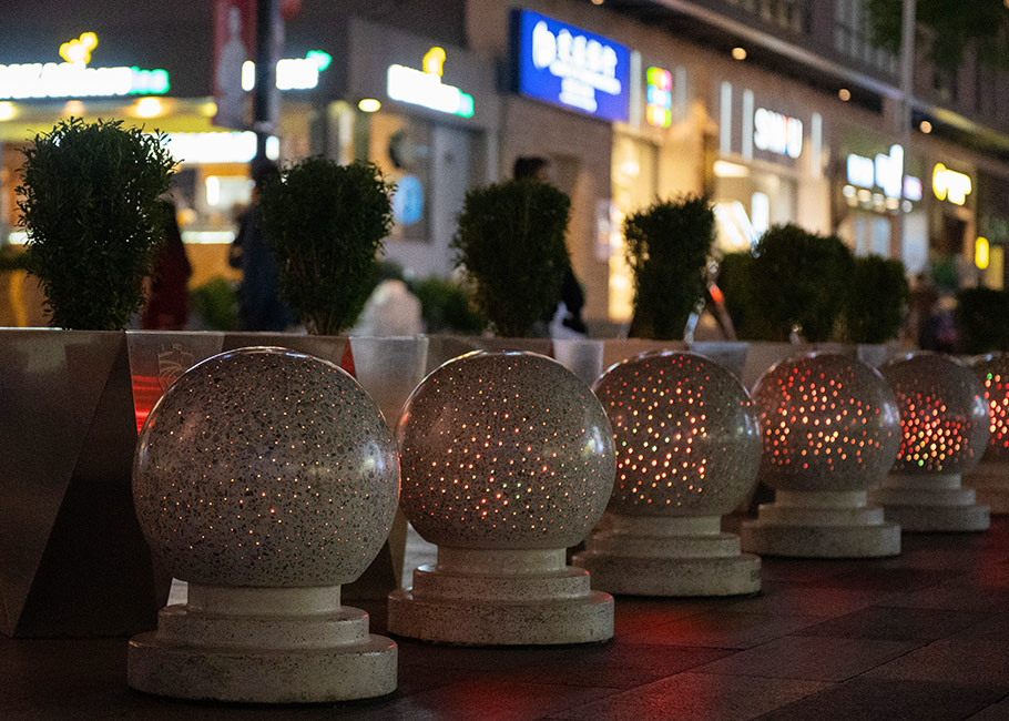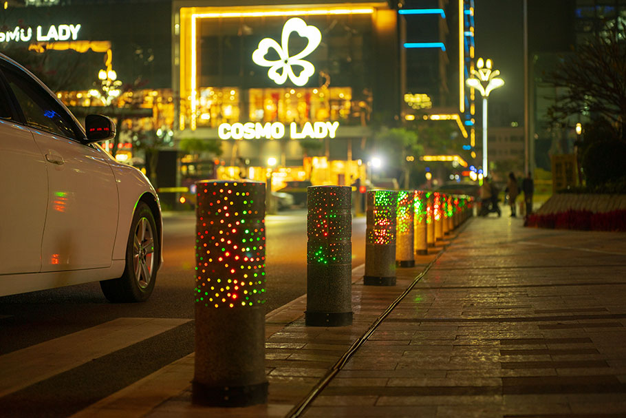 新型路障石材具有擋車功能,提升場所的形象和安全性,夜晚展現出特別絢麗的效果